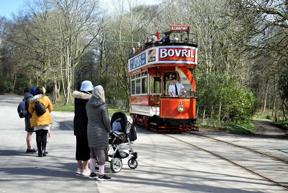 Stockport 5 - with a healthy load on top - waits for pedestrians to cross the track as they go for an afternoon stroll in the park.