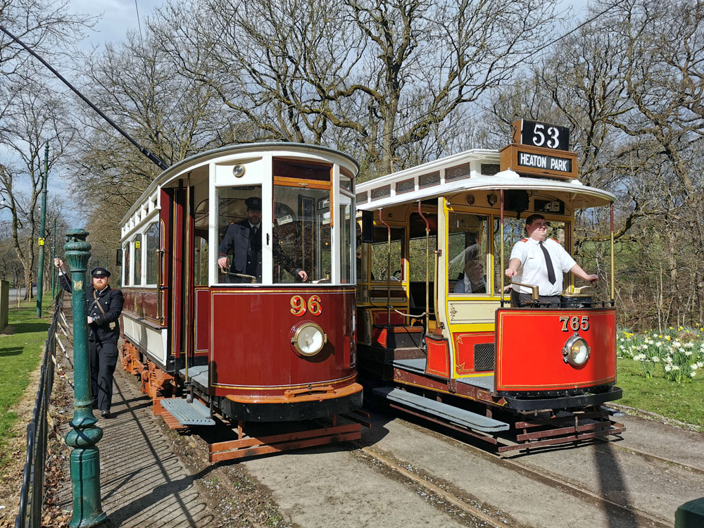 Hull 96's trolley is turned as it stands alongside Manchester 765 on the double track section down to Middleton Road Gates.