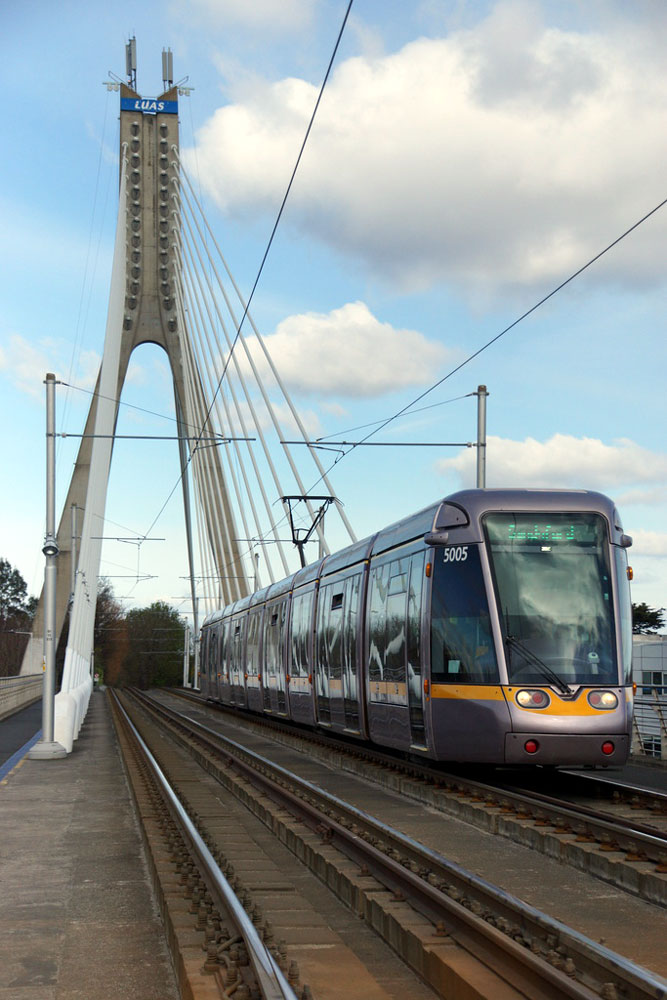 The Luas logo can be seen at the very top of the bridge as we see 5005 with a service to Sandyford.