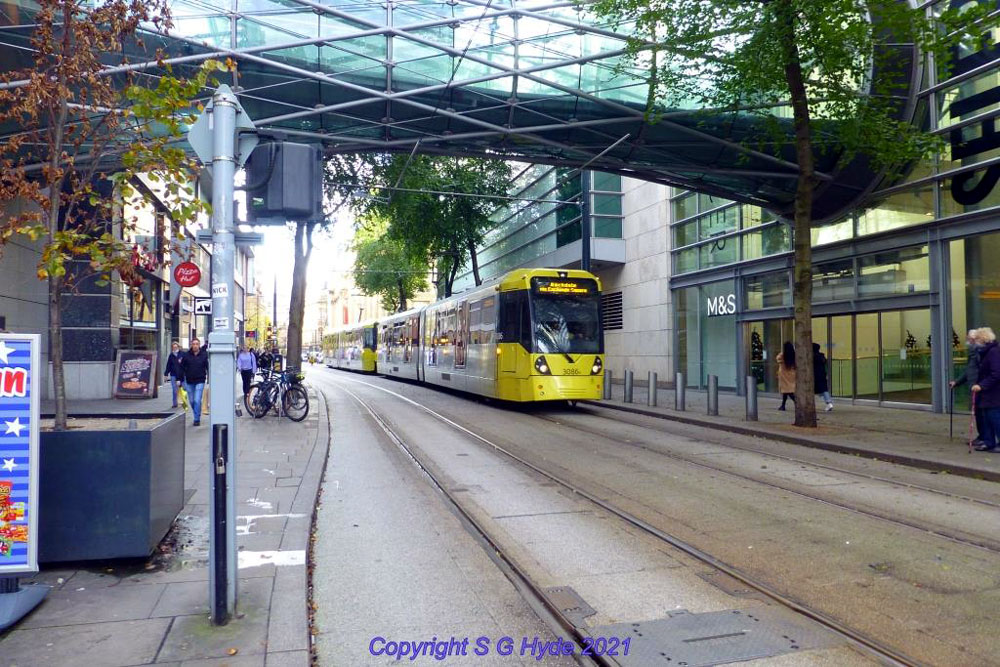 24 hours later on Friday 19th November and approaching Exchange Square is a double unit comprising 3086+3132 working a trip between East Didsbury and Rochdale Town Centre.
