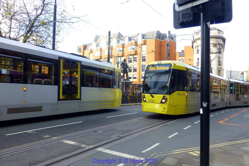 Moving across the City now this photograph was taken at the junction of Cross Street and Princess Street and catches 3063 and 3030 passing on services on the East Didsbury to Oldham/Rochdale lines.