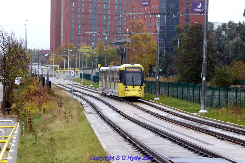 Alongside Trafford Wharf 3070 approaches the camera on a Cornbrook to Trafford Centre working. Note the destination screen now shows The Trafford Centre instead of the former Intu Trafford Centre display.