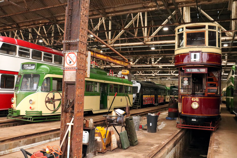 Bolton 66 was for much of 2021 the only vintage tram available for use and is seen here in the depot with Brush Cars 621 and 634 on the left.