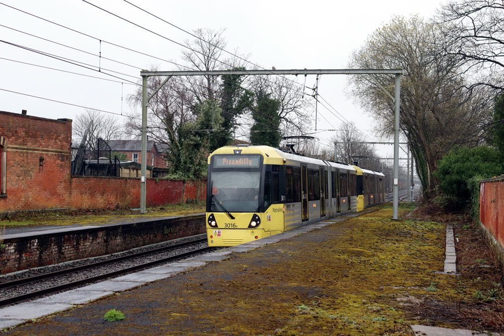 The moss covered closed section of platform at Sale (when converted to Metrolink operation the extreme ends of the platform were not needed for the trams) is passed by 3016+3060 which are heading to Piccadilly.