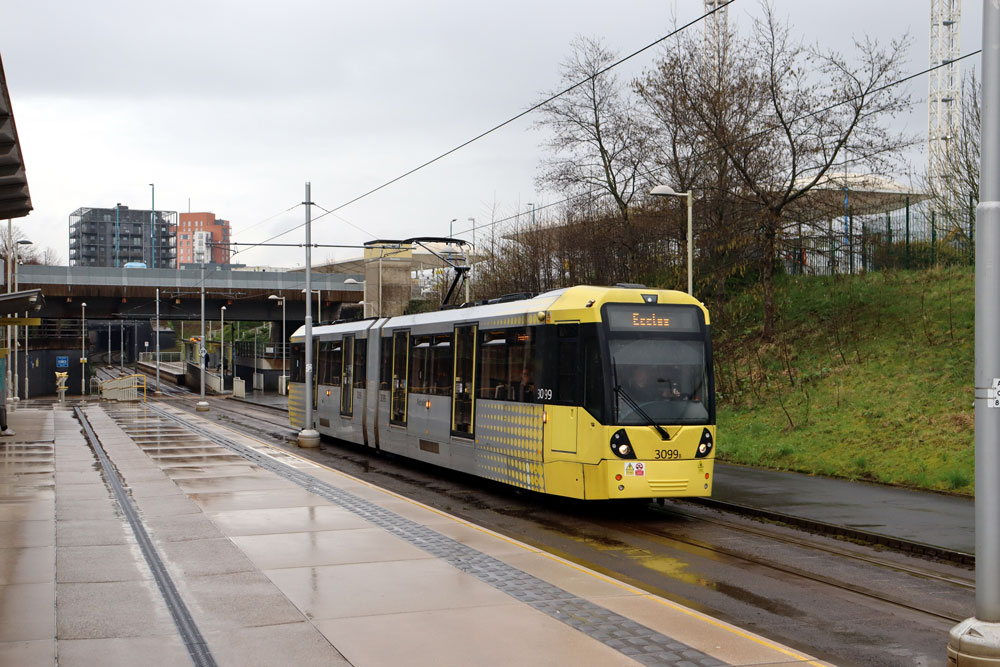 3099 is working from Ashton to Eccles when seen at Etihad Campus.