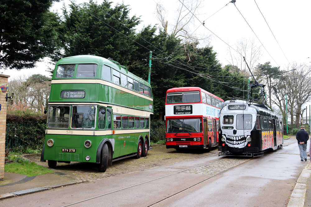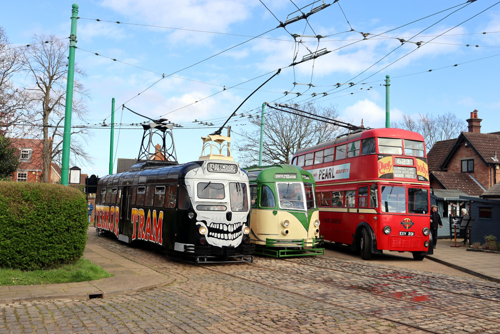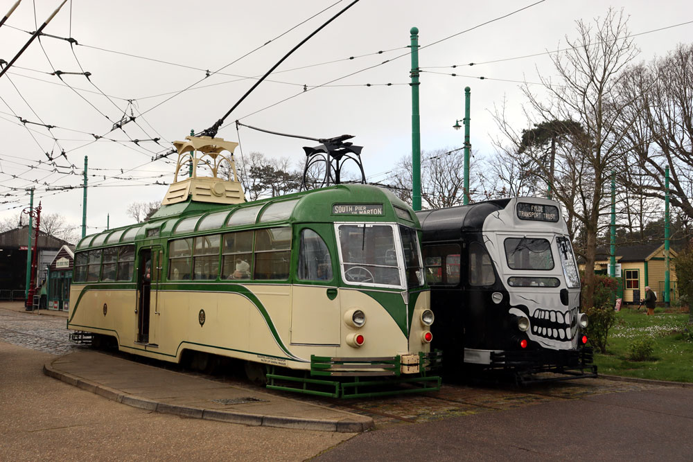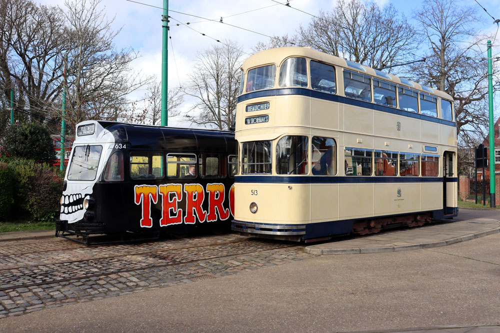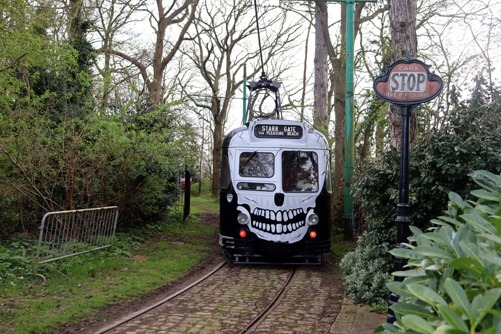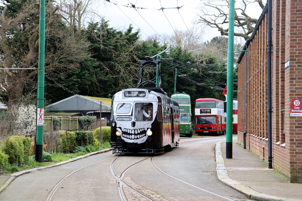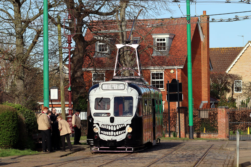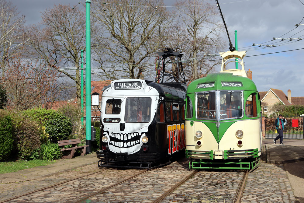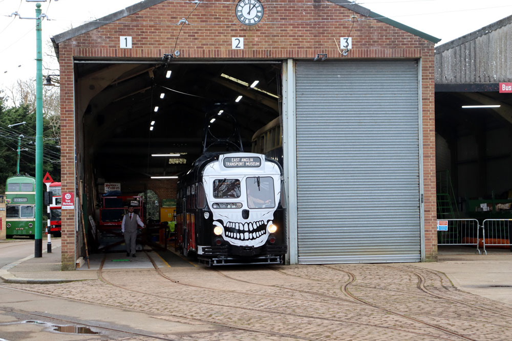 Good Friday 29th March 2024 saw Blackpool Brush 634 launched into service for its first runs in preservation and for the first time in almost 20 yeasr (it was withdrawn in October 2004). Now owned by the Fylde Transport Trust the tram - in an approximation of a former advert livery now carrying signwriting for "Terror Tram" - is on a 5 year loan to the East Anglia Transport Museum who completed work on the tram at the end of 2023 following its arrival from Blackpool in November.