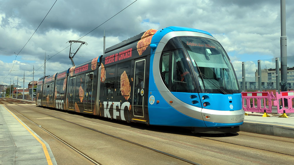 There is a mixture of the Urbos3 and Urbos100 trams which make up the fleet and whilst most are in the standard fleet livery we also see a couple of advertising liveries. This includes 58 which was making its debut on this day in an ad for KFC. * Photos from Steven Hughes from this visit can be found on YouTube. |