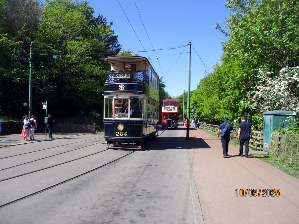 With the sun shining the museum was busy on this day and saw a three-tram service in operation with the high capacity trio of Sunderland 16, Blackpool 31 and Sheffield 264 in action. The advantages of a normal opening day over an event day is that trams run both clockwise and anti-clockwise and so we see trams going both ways round. There is also the chance to take a quick look into the depot where work continues on returning Gateshead 10 to service. As well as the trams there are also some glimpses of the buses which now complement the trams in transporting people around the museum site. |