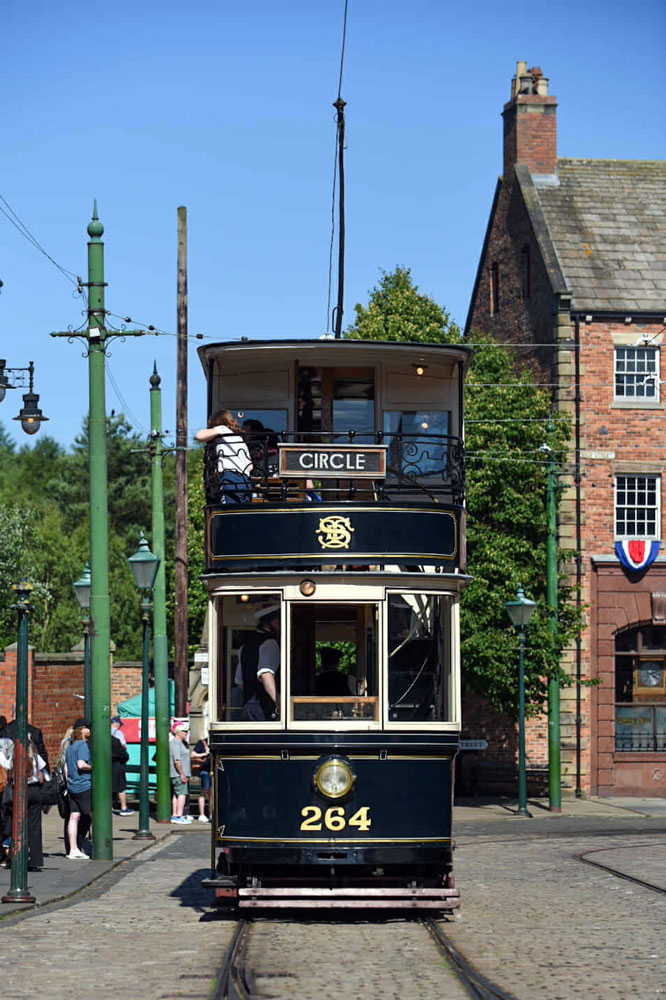 On this visit - at the end of June 2025 - there are three trams which are out in service: Blackpool 31, Oporto 196 and Sheffield 264. On the first day of the visit all three were out with 31 and 264 clockwise and 196 anti-clockwise, the Monday saw 31 clockwise. They are joined out on the roads by buses and we also see a vintage car in the 1900s Town too. |
