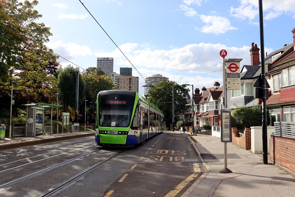 2561 is the next tram we come across on Addiscombe Road as it approaches Lebanon Road tramstop bound for Beckenham Junction.
