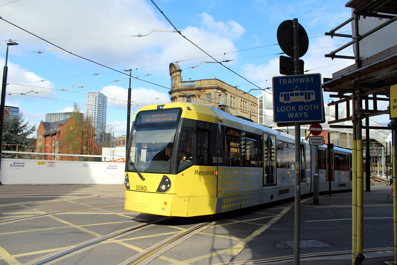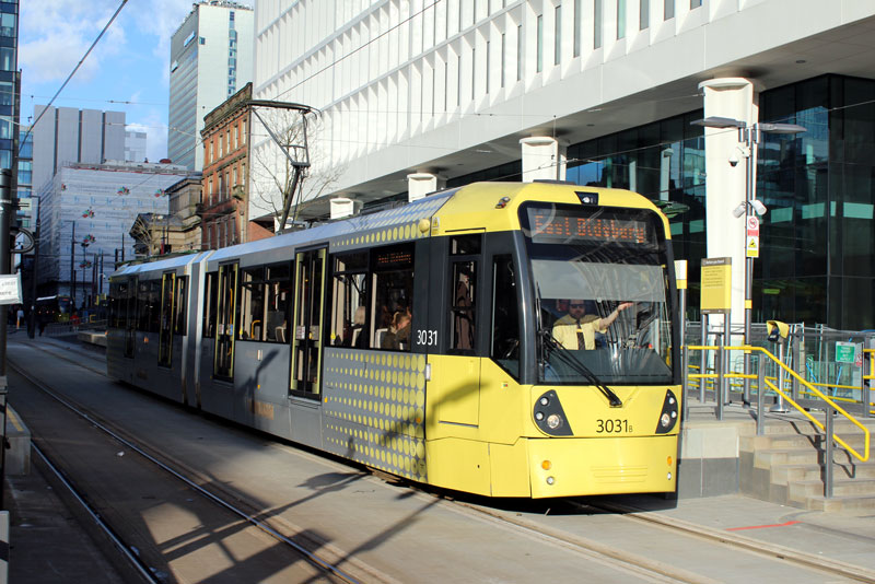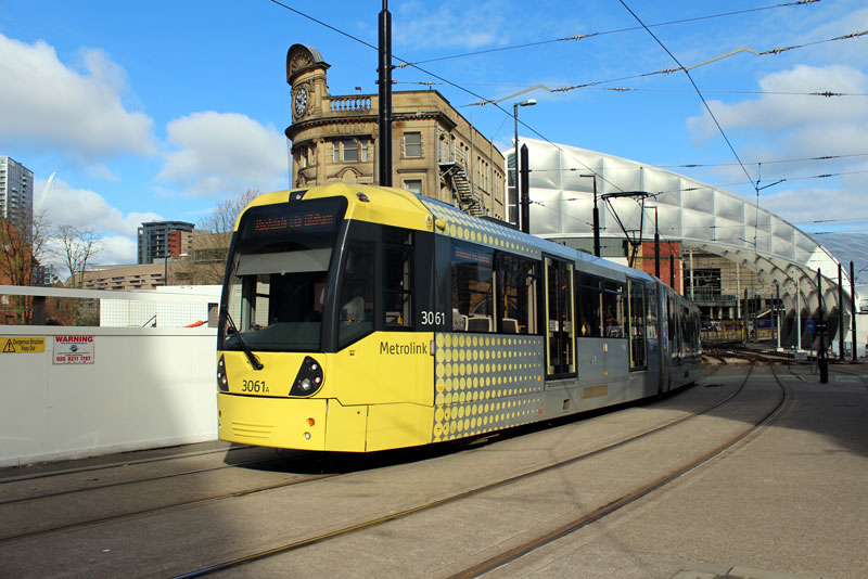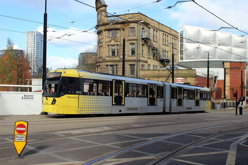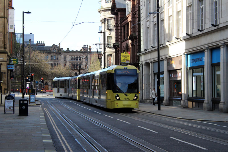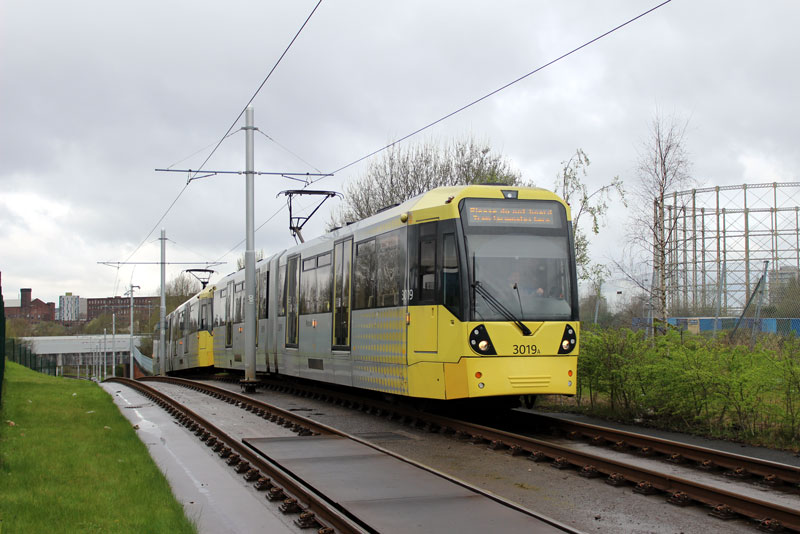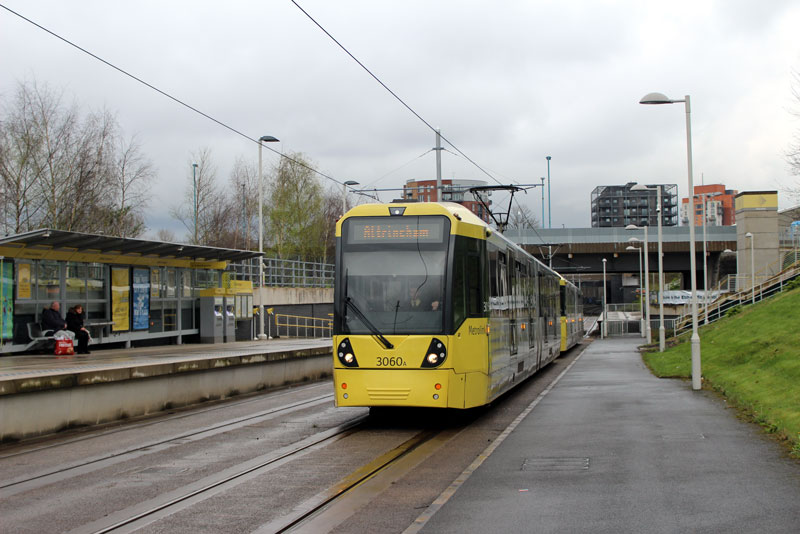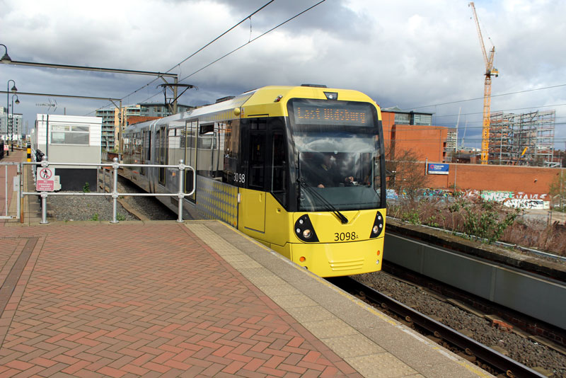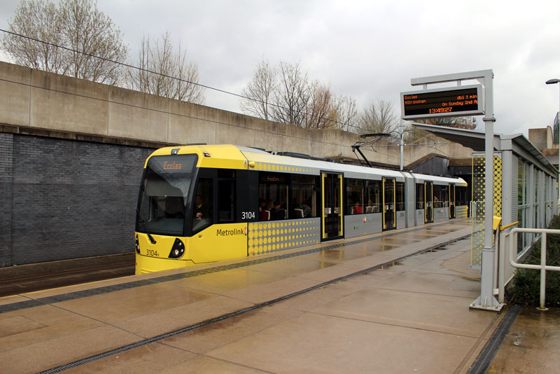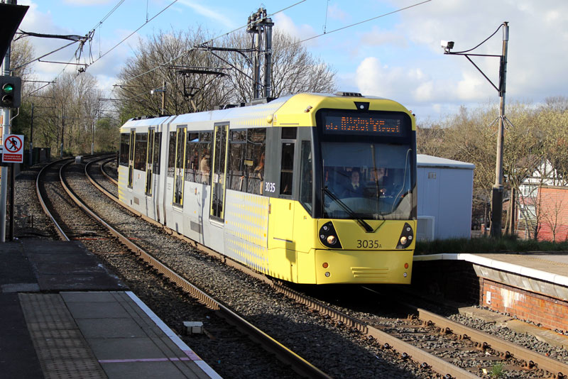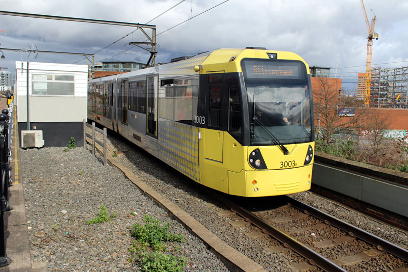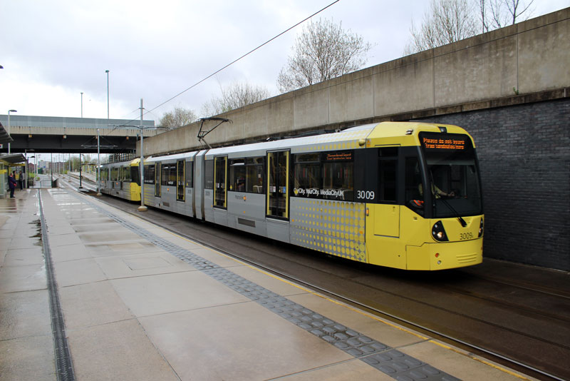 A selection of photos from Manchester Metrolink taken over the first weekend of April. Images come from various locations across the network showing both single and double units in action in the rain, cloud and sun! Sunday 2nd April also saw the first use of the Second City Crossing (2CC) for services other than between the East Didsbury and Oldham/Rochdale lines with Altrincham to Bury direct services diverted to use the newest line because of trackworks in the city centre. |