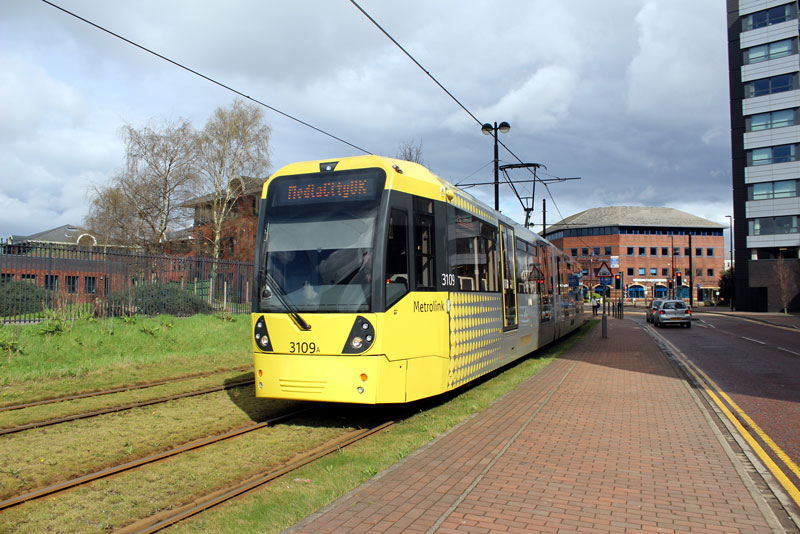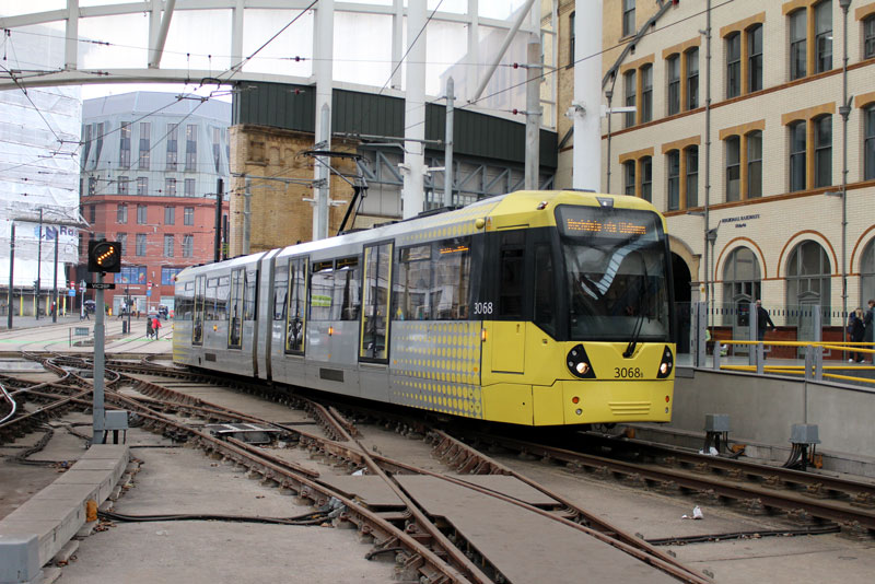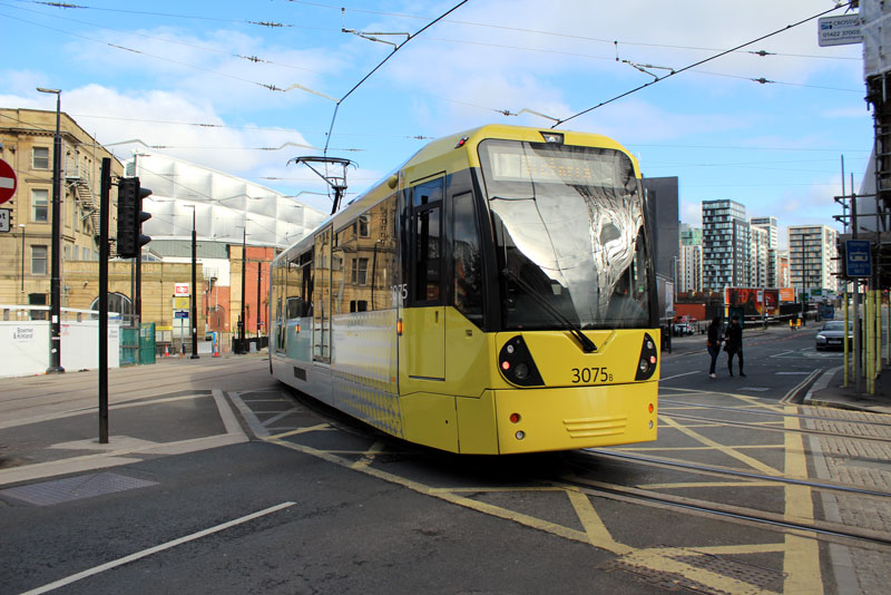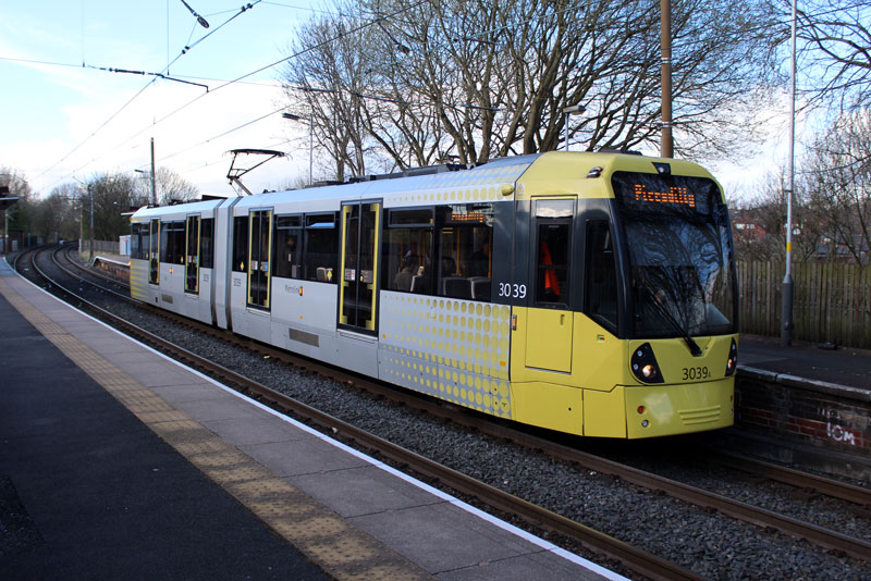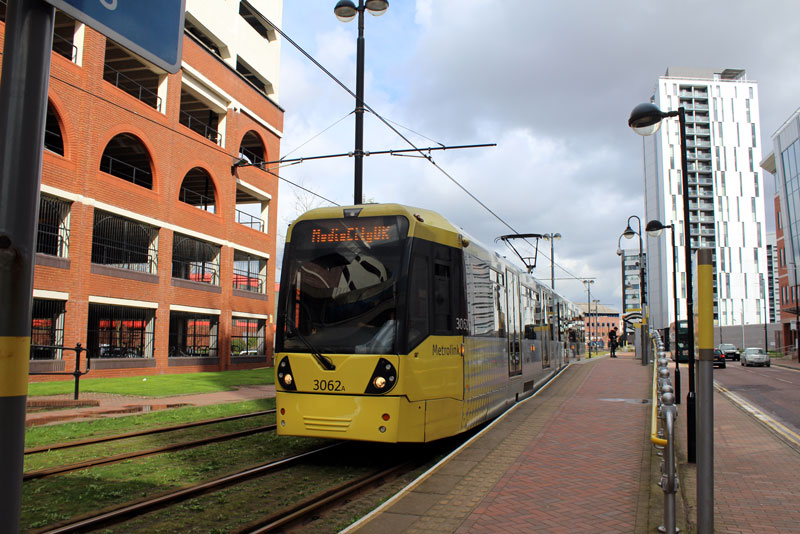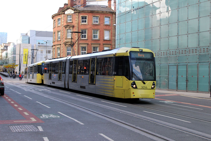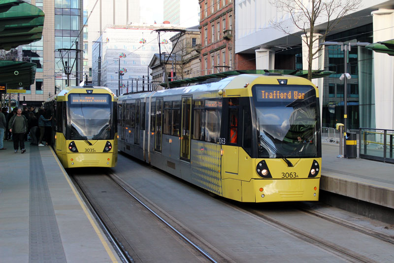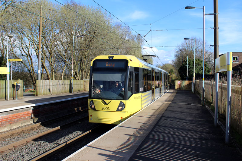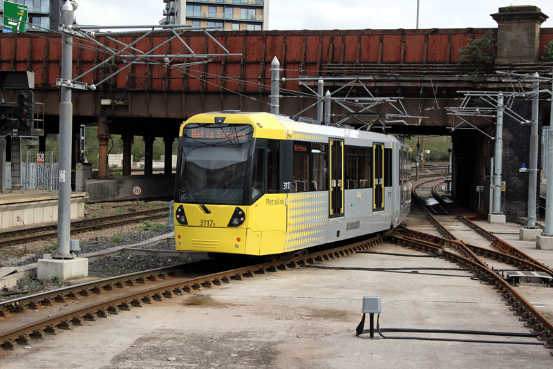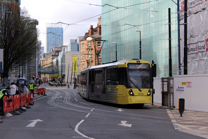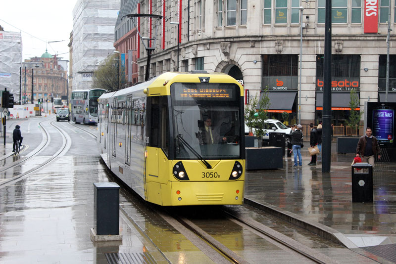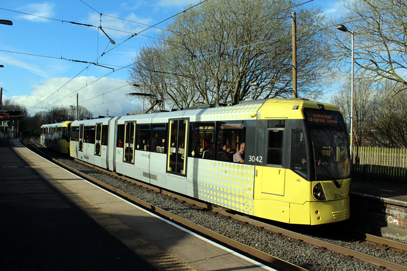 A selection of photos from Manchester Metrolink taken over the first weekend of April. Images come from various locations across the network showing both single and double units in action in the rain, cloud and sun! Sunday 2nd April also saw the first use of the Second City Crossing (2CC) for services other than between the East Didsbury and Oldham/Rochdale lines with Altrincham to Bury direct services diverted to use the newest line because of trackworks in the city centre. |
