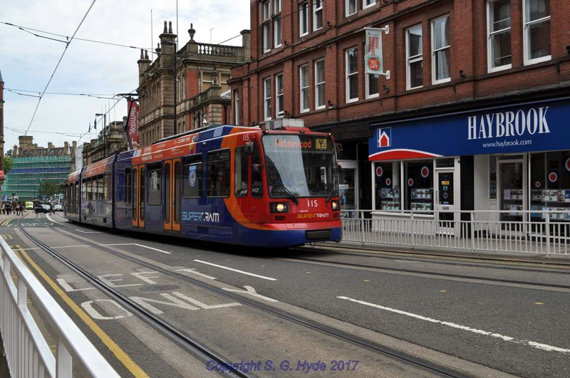 Moving now to Church Street car 115 heads out of the city on a yellow route service to Middlewood.