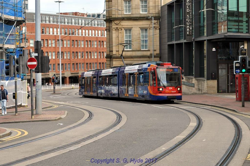 Now on West Street car 104 climbs towards City Hall stop on a blue route service to Malin Bridge.
