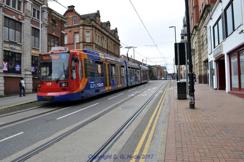 Leaving City Hall stop is car 109 on a blue route service to Malin Bridge.