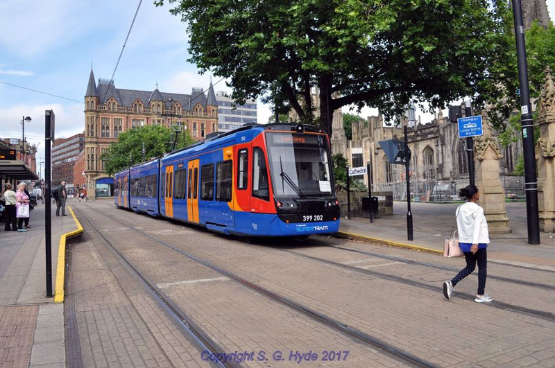 We now see 399 202 standing at Cathedral stop waiting to depart on its next training trip. As it transpired this would take it back to Nunnery Square Depot.