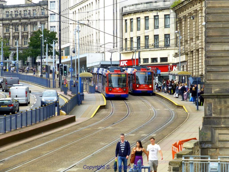 Seen from the western approach to the bow string bridge over Park Square are cars 108 and 125 on services to Middlewood and Halfway respectively.
