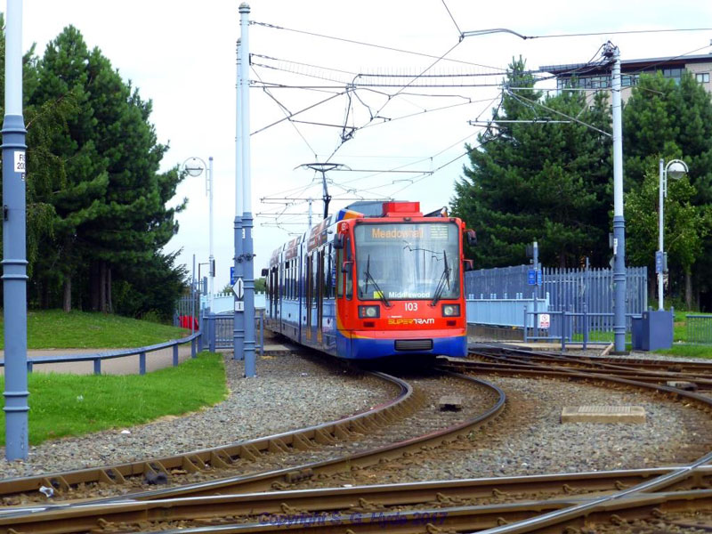 Taking the north eastern curve at Park Square delta junction is car 103 bound for Meadowhall.