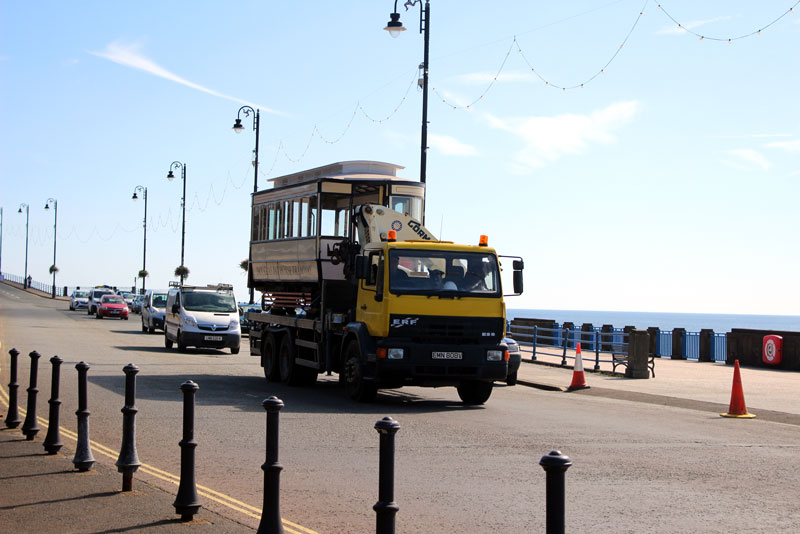 A surprise on this day was the return of Douglas Bay Horse Tramway 1 which had been up at Laxey for the birthday party on the previous Sunday. With the lorry approaching its final destination we see the tram adjacent to the Derby Castle terminus.