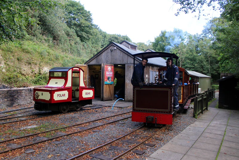 Down at the Groudle Glen Railway and Annie brings her two carriages into Lhen Coan Station. It is passing battery locomotive Polar Bear.