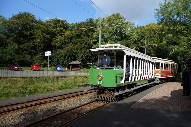 Still at Dhoon Glen this time we see 32+57 arriving at the stop from the north as it heads back to Derby Castle.