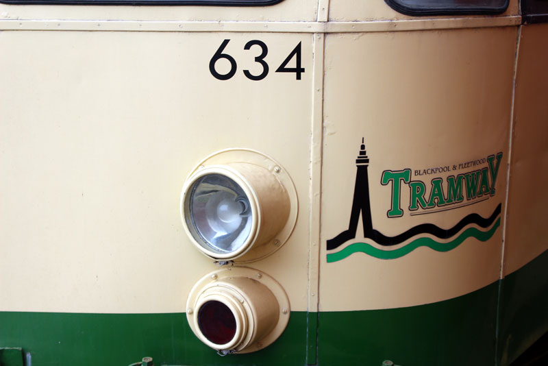 A close-up of the corner of 634 showing the Tower and Waves 1990s Blackpool Transport logo.