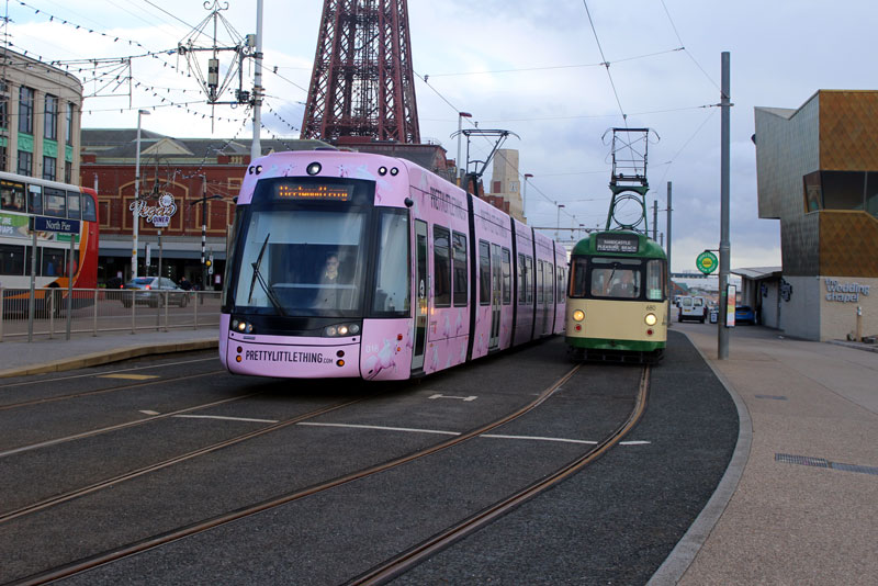 One of two Flexity2s to have received an advert for PrettyLittleThing.com is 016 and we see the tram here passing through the centre track at North Pier with Railcoach 680 on the loop line waiting to pull forward and then reverse before going back to Pleasure Beach.