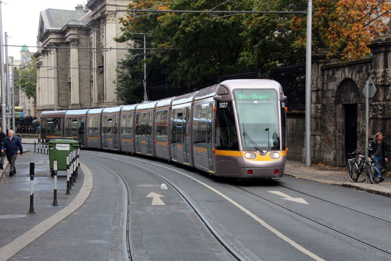 5027 with a Sandyford bound service snakes along the short section of Grafton Street which is not pedestrianised. The frontage of Trinity College is behind the tram.