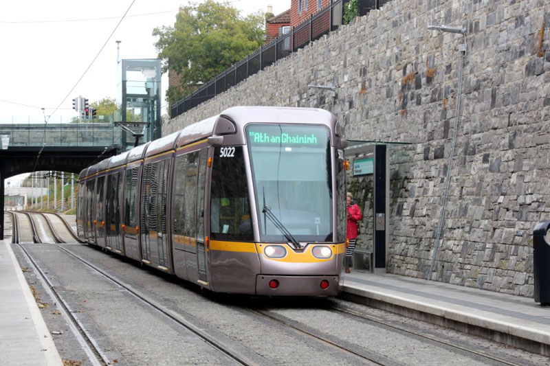 5022 comes to a stop at Phibsborough with a Sandyford bound service. The stop at Cabra can be seen in the far distance. The line here is in cutting which was original where the railway line ran from the Broadstone Dublin terminus to places on the west coast of Ireland.