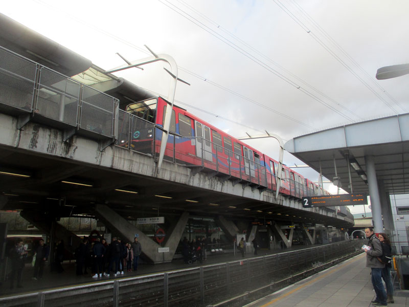 ![]() 64 arriving at Canning Town High Level, to either Beckton or Woolwich Arsenal, with the London Underground Jubilee Line platforms below, seen from the low level DLR station on the right. |