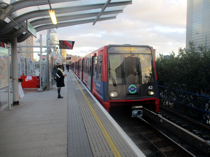 42 at head of train to Tower Gateway arriving at Poplar station.