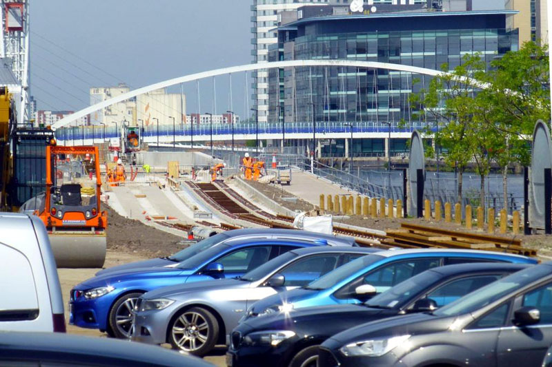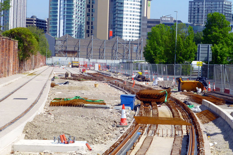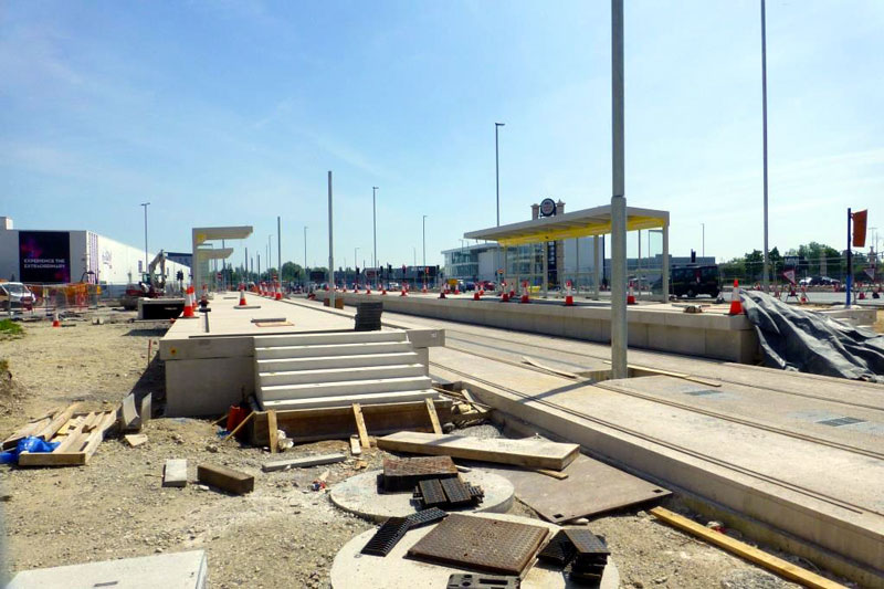 | The next (and currently last) extension of Manchester Metrolink to open will be the 5.5km line from Pomona to the Trafford Centre with opening scheduled for 2020. Construction of the line is now well underway and excellent progress is being made on both the platform infrastructure and track laying. This selection of photos shows this good progress with images all taken during mid-May. |