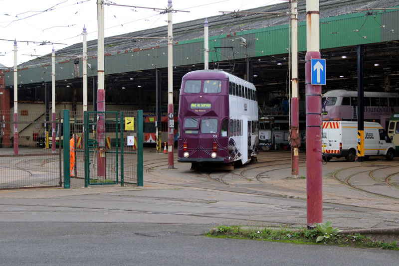 ![]() For the remainder of this gallery we now head down to the depot(s) - mainly Rigby Road but also inside Starr Gate - for views not only of the special tram displays but also other comings and goings. In this first photo of this section we see B-fleeter Balloon 711 just leaving Rigby Road for an evening on specials on Thursday 26th September. As well as seeing 711 departing we can also take a look inside the depot where we can see trams as diverse as Centenary 645, the roof advert boxes on Brush 632 plus runners the Frigate and fellow B fleet Balloon 713. Photograph by Gareth Prior |