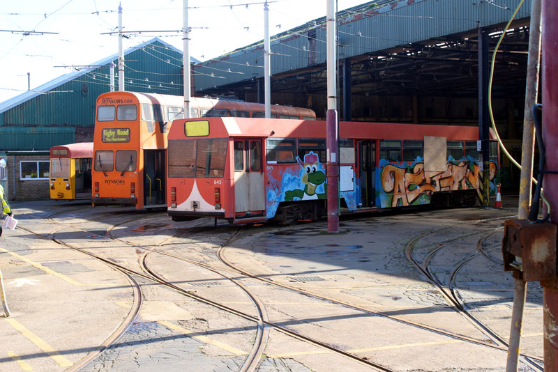 ![]() Each day of the September Spectacular saw two line-ups at Rigby Road Depot, one on the depot fan and one along Blundell Street. On Saturday 28th September the depot fan was devoted to the OMO story with three trams displayed: OMO 8, Jubilee 761 and Centenary 645 - all non-runners. Photograph by Gareth Prior |