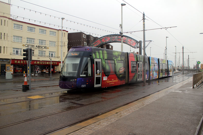 The latest advert to be applied to a tram in Blackpool is this design for Merlin attractions in Blackpool with every end and side of the tram giving you a different viewpoint! In this photo taken at Bispham we see 001 just arriving heading south with this end showing the Madame Tussauds section featuring the Incredible Hulk.