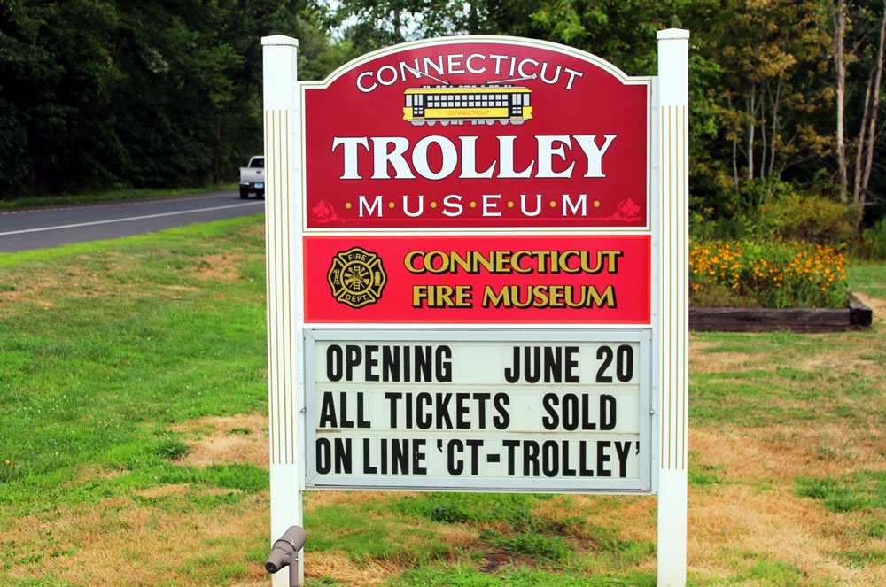 The entrance sign to the museum which is also home of the Connecticut Fire Museum. As we've become used to in the UK in 2020 the sign says it all - "All tickets sold on line".