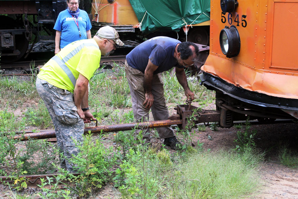 A towbar is attached to the coupler of Boston Elevated Railway 5645.