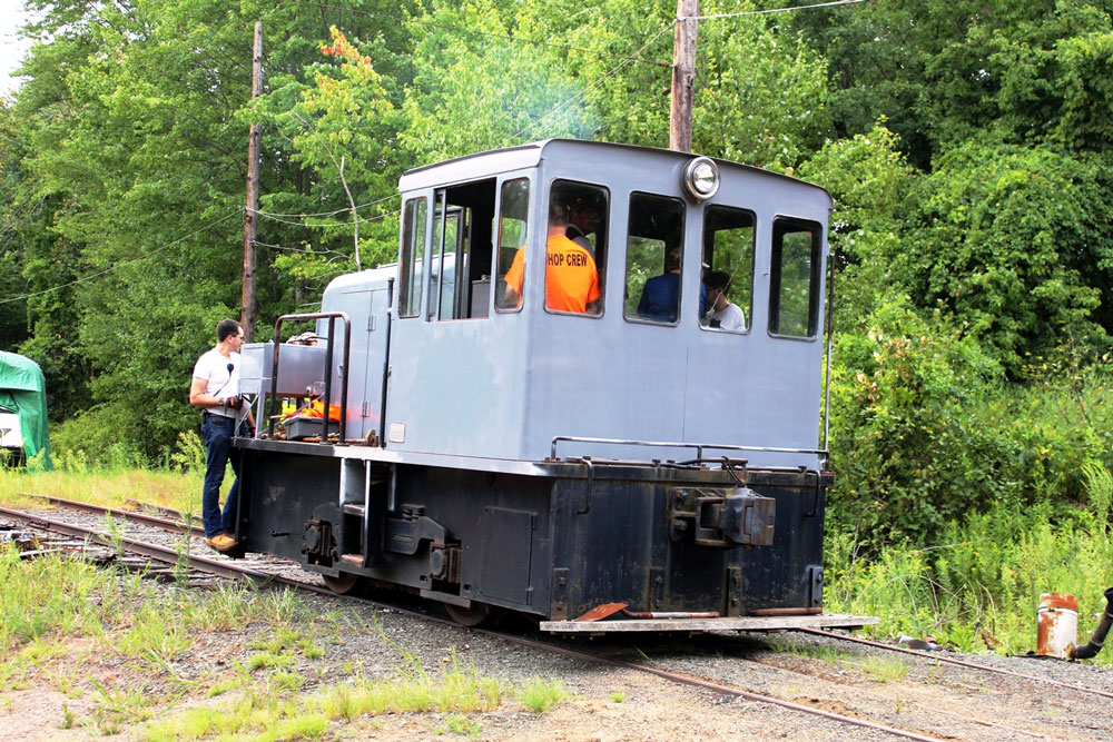Everyone piles onto the locomotive, Hartford Electric 1 as it moves to its next task. This is the cab end.