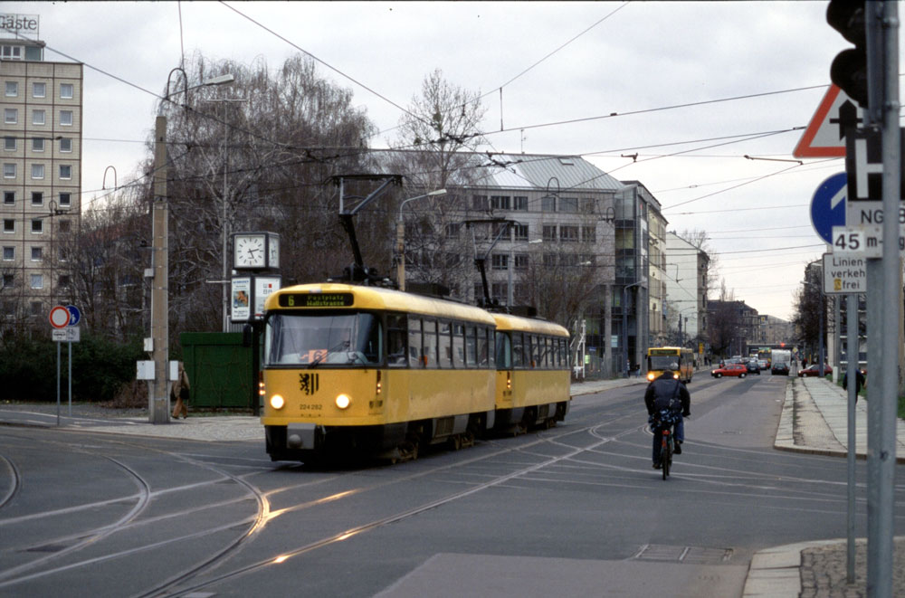 In this collection we feature images taken in Dresden, Germany showing the tramway as it was in 2003 and 2004. Trams first ran in the city in 1872 when the first horse drawn service started operation with electric operation taking over from 1893. The system today runs of the unusual gauge of 1,450mm (only 15mm wider than standard gauge) with this often described as the "Dresden gauge". The network has seen continued expansion in recent years - with some of it taking place since these photos were taken - and it has now reached a total of 134km - the most recent change was the realignment of a 1.1km section on roues 9 and 13 to give better connections with train services at Dresden Stehlen station. The fleet is now mainly made up of modern low-floor trams - a mixture of vehicles built by Deutsche Waggonbau and Bombardier - but also retains some older Tatra vehicles.