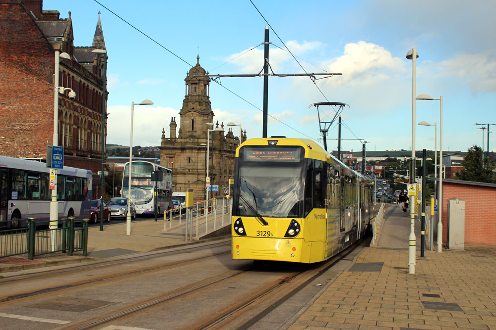 The other end of Oldham Mumps stop now as 3129 - another of the new batch of M5000s being built for Metrolink - departs heading into Manchester and then onto East Didsbury.