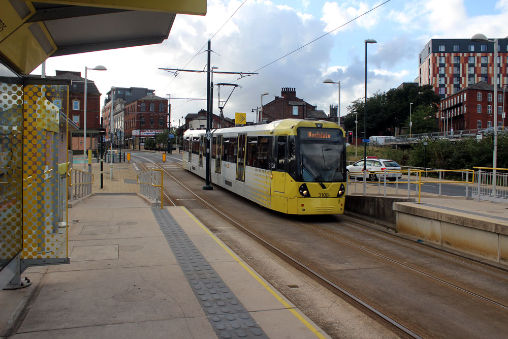 3108 drops down to Oldham Mumps as it continues a service to Rochdale.