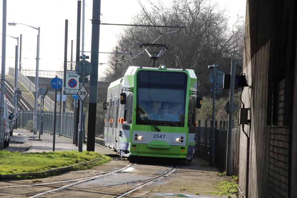 2547 has just dropped down from the flyover and is about to run under the Roman Way flyover as it runs on route 3 from Wimbledon to New Addington.
