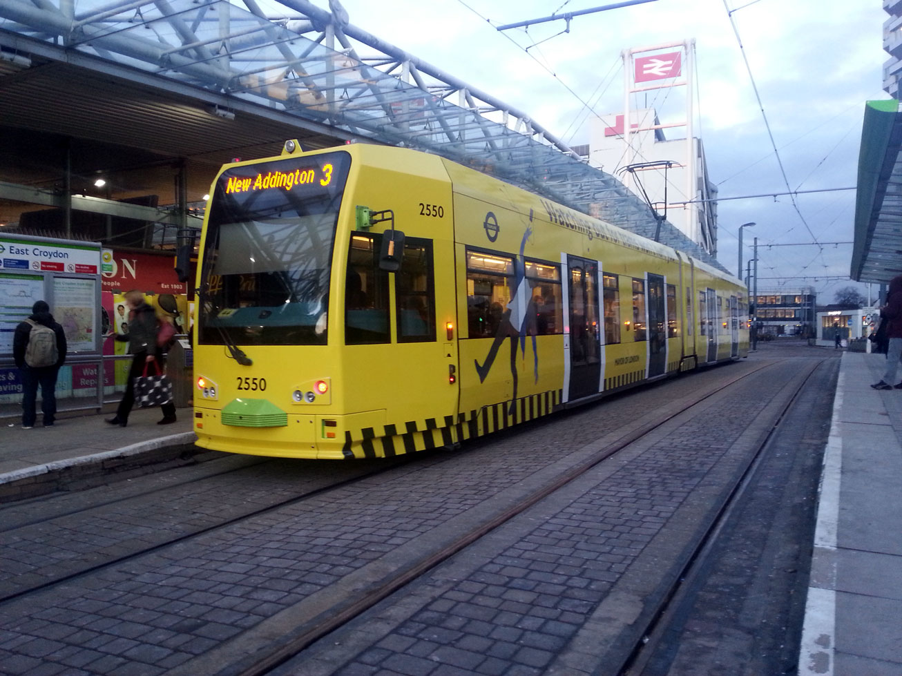 2550 pauses at East Croydon on 19th January in the fading light. This was the first day of its new advertising livery. (Photo: Ian Buck)