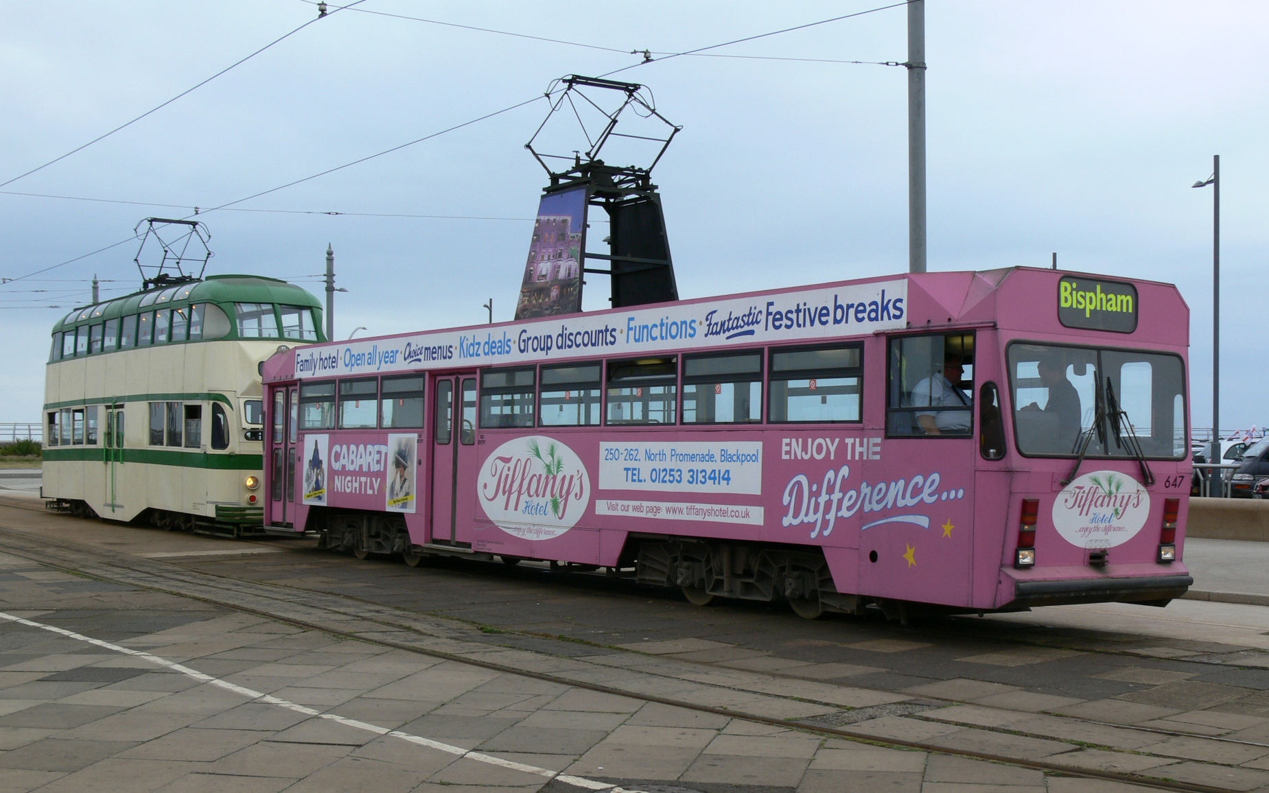 An archive shot of 647 sharing the Pleasure Beach outer loop (before it was remodelled) with Balloon 703 in 2006. The tram is seen in its pink advert livery for Tiffany’s Hotel. (Photo by Tony Waddington)