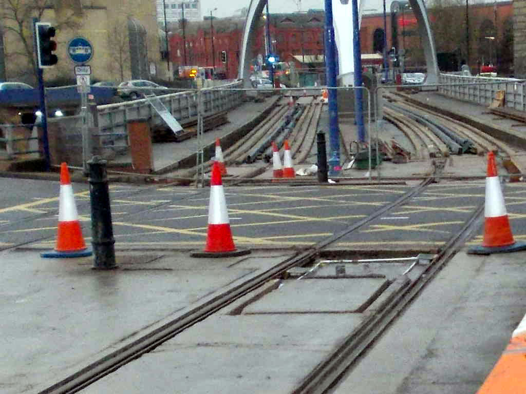 More relaid track on Bilston Road but note that no new track has been laid across the island or on the Wishbone Bridge. (All Photos by Michael Averill on 14th February 2015)