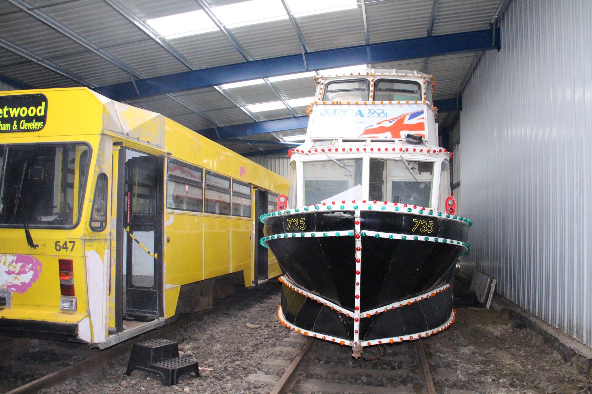 The unique Hovertram is seen in its new home earlier this year, alongside other of NEETT’s Blackpool trams – Centenary car 647. (Photo courtesy of the North Eastern Electrical Traction Trust)