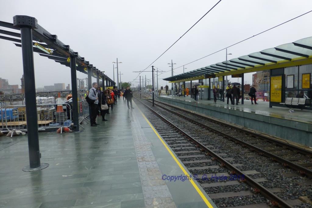 The rather damp scene on the opening morning is seen here as commuters wait for their trams in typical Manchester heavy drizzle.