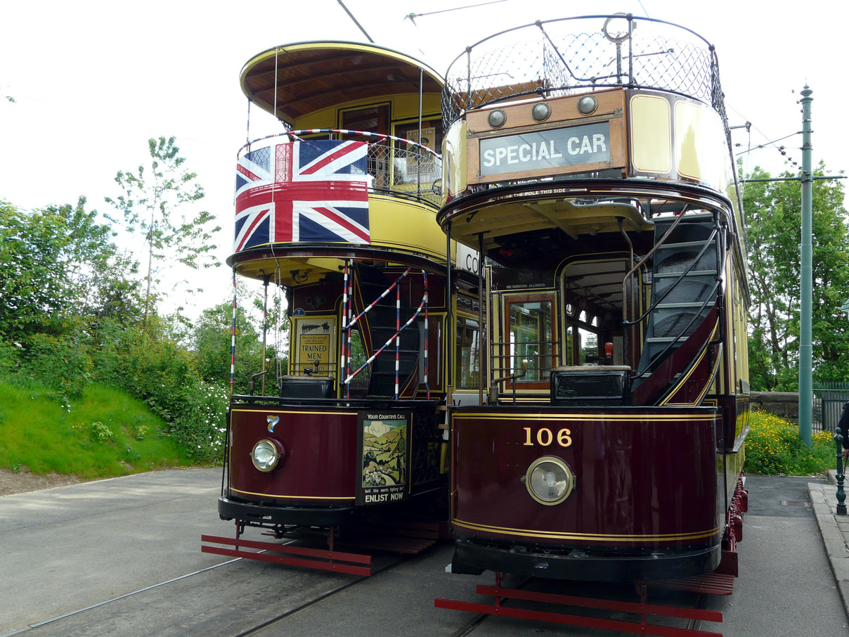 London County Council 106 will be relaunched into service on Saturday 13th June and has recently been undergoing final testing at Crich ahead of this. Here it is seen alongside Chesterfield 7 on 9th June. (Photograph courtesy of Crich Tramway Village)