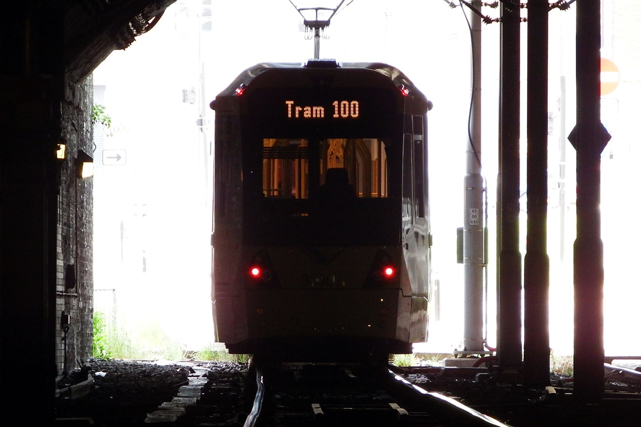 Looking through the undercroft at Piccadilly we see 3100 silhouetted with the destination display proudly displaying Tram 100.