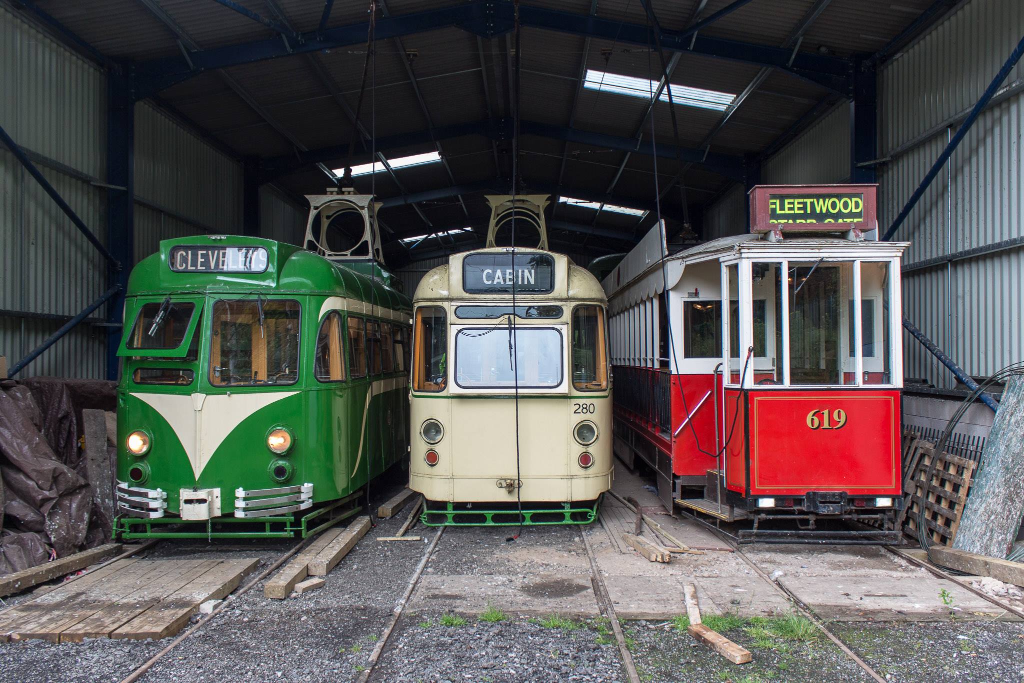 An all Blackpool single deck line-up with Brush car 623, Ex-Towing car 680 and Vanguard 619 at the front of Lakeside Depot.